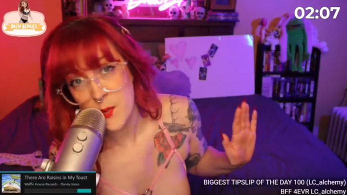I like that this is a moment where we can enjoy her company and sexy side as well. DrewBerries is showing her boobs by pulling her bra down a bit, but keeping the rest of her clothes on to make the flash feel more daring and surprising, and I even love that at this point of her tease the TV in the background is off, so all distractions are minimized and we can fully enjoy her gift of allure.