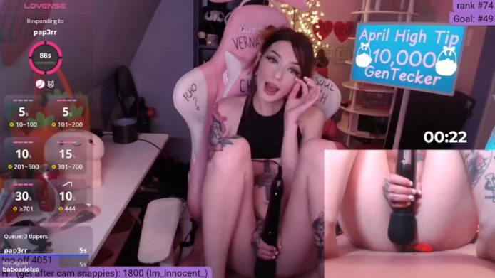 She flashes her tits without taking off her top, which gives her tease a feeling of enthusiastic eroticism while this gorgeous cam girl gives us a special treat where she opens up a secondary cam to show us a closer view of her pretty pussy, which is all shaved, pink and ready to play with a big wand that tickles it with its lustful vibes.