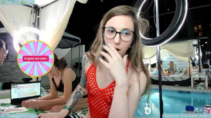She’s wearing a very special swimsuit that looks like it’s made out of red fishnets and there’s even a special MFC Social tip menu here to keep everyone in her chat busy. Right now her wheel is going for a spin and stops on a very fun challenge: doing 10 spanks on each of her cheeks. Of course she doesn’t have to do that herself, she can simply get help from the other models around her as they quickly start spanking her cheeks red.
