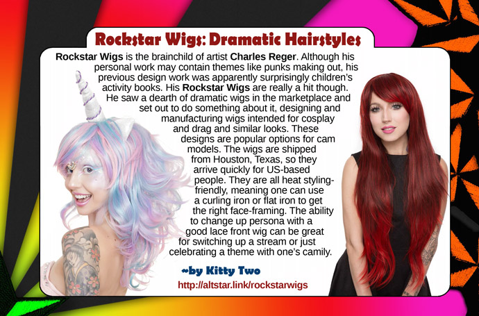 Rockstar Wigs is the brainchild of artist Charles Reger. Although his personal work may contain themes like punks making out, his previous design work was apparently surprisingly children’s activity books. His Rockstar Wigs are really a hit though. He saw a dearth of dramatic wigs in the marketplace and set out to do something about it, designing and manufacturing wigs intended for cosplay and drag and similar looks. These designs are popular options for cam models. The wigs are shipped from Houston, Texas, so they arrive quickly for US-based people. They are all heat styling-friendly, meaning one can use a curling iron or flat iron to get the right face-framing. The ability to change up persona with a good lace front wig can be great for switching up a stream or just celebrating a theme with one’s camily.