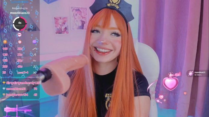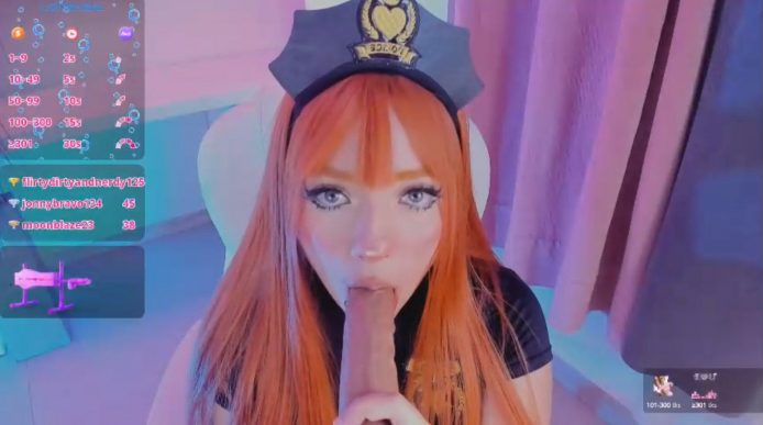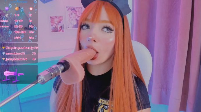 Looks like she’s joined the police force in a very cute way and she’s in the middle of an arrest as her hands wrap themselves around a huge dildo. It’s actually attached to a fuck machine that begins wiggling back and forth, but that doesn’t deter Kloe_raize. She just wraps her lips around it instead to keep it steady and from going away anywhere.
