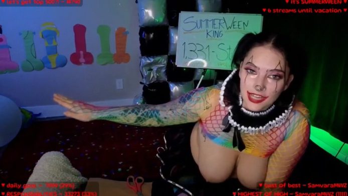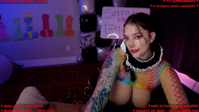 This busty beauty is wearing a costume and makeup to become a sweet clown, one with a fishnet top that leaves her big boobs bare, so that we can admire them non-stop on this stream while she presents to us some fun balloon animals.