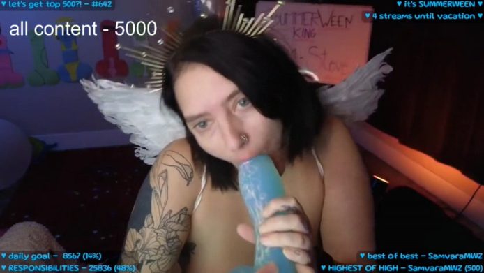 Her nipples are visible through the subtle sheerness of her bra, and she shows us her heavenly blowjob skills on a dildo that’s thick and sky blue, which furthers the celestial concept that MollyMeowz is working with on this cam show while she sucks on that toy, and even goes cross-eyed a bit whenever that big toy of hers pushes deeper into her lovely mouth.
