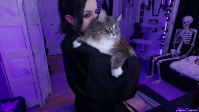 As this discussion happens, MoonConjured also gives us a sweet treat. She goes to get Axelle, her lovely kitty, and she carries her and cuddles with her for a bit in an amazing treat that makes this hangout with this gorgeous girl even more adorable and cozy.