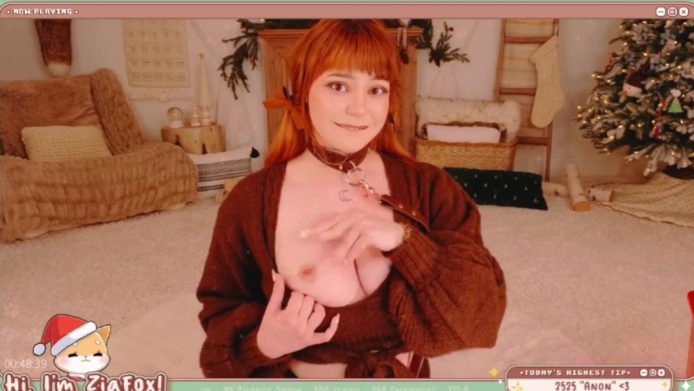 There’s a super fun and sexy atmosphere in the room. ZiaFox is fully clothed, but her outfit lets us see a great cleavage and the shape of her booty as she moves around the room, engaging in all the fun activities that arise during this stream.