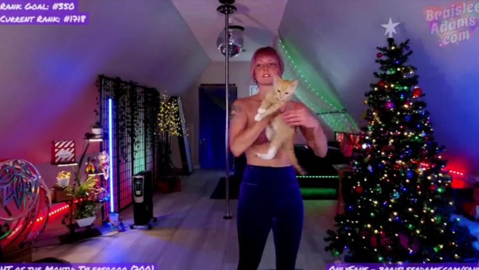 I’d heard about kitties doing this, but I’ve never seen it happen until now, and I like the patience that BraisleeAdams displays while dealing with this little situation before she continues with the dazzling topless hoop dancing in her cam room.