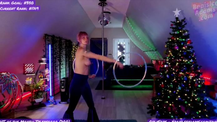 Her Christmas tree is up, BraisleeAdams has just finished a dancing tease, and she is now hanging out with her top off, showing us her boobs and her nipple piercings while something else happens.