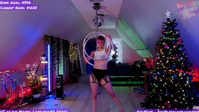 After the dance, a moment of sensuality and comfort ensues. BraisleeAdams takes off her white top and continues the seductive festivities while letting us admire her gorgeous body while topless in the lovely Christmas setting that she’s camming in.