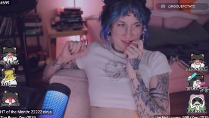 There are also some sweet flashes where sluttypotato reaches for her top, and while she doesn’t take it off all the way, she folds it up enough to bare her tits while she continues the displays of cuteness.