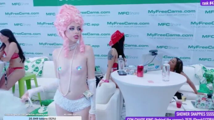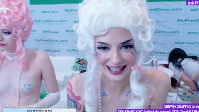 They both cam with a playful style that mixes modern sexiness through pasties covering her nipples and skimpy bottoms with a touch of 18th century elegance with the wigs that these two gorgeous girls are wearing while they interact together in fun little ways, like when elunaxc spanks BabeAriel’s sexy booty with a paddle for a touch of that sweet spicy goodness that’s so lovable.