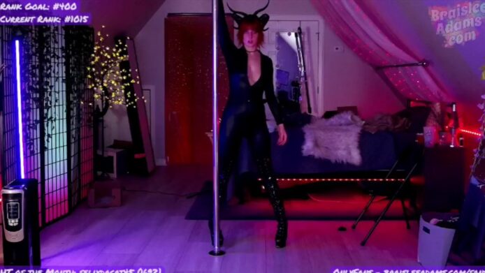 BraisleeAdams dances on her pole with movements that show grace and that delightful feel of lustful temptation that’s prevalent in the room, and which serves as a spring of allure that prepares us for that sweet moment when the bodysuit comes off, and this beauty is left only with her panties and the horns on her head to continue her scrumptious teases.