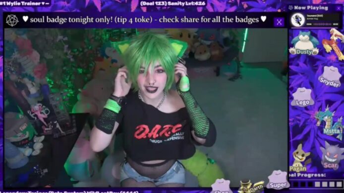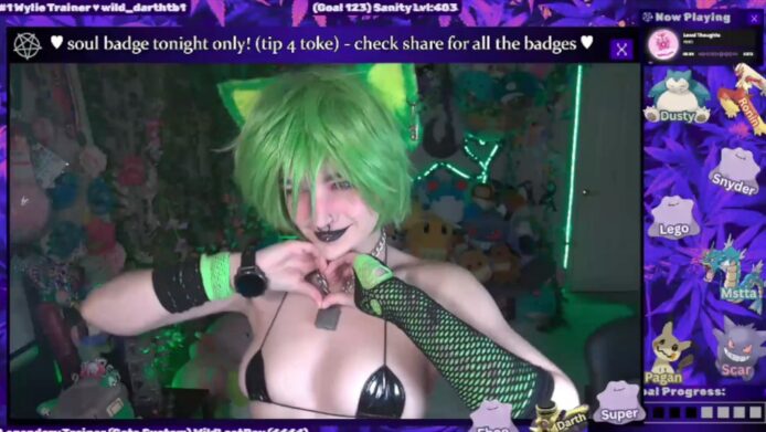 WildWyliePM takes off the top, and her daisy dukes, revealing the skimpy bikini that she wears underneath, which opens up a whole new avenue of sensuality and playfulness that also has some adorableness attached to it with the cute ears and the green hair she wears for this awesome stream.